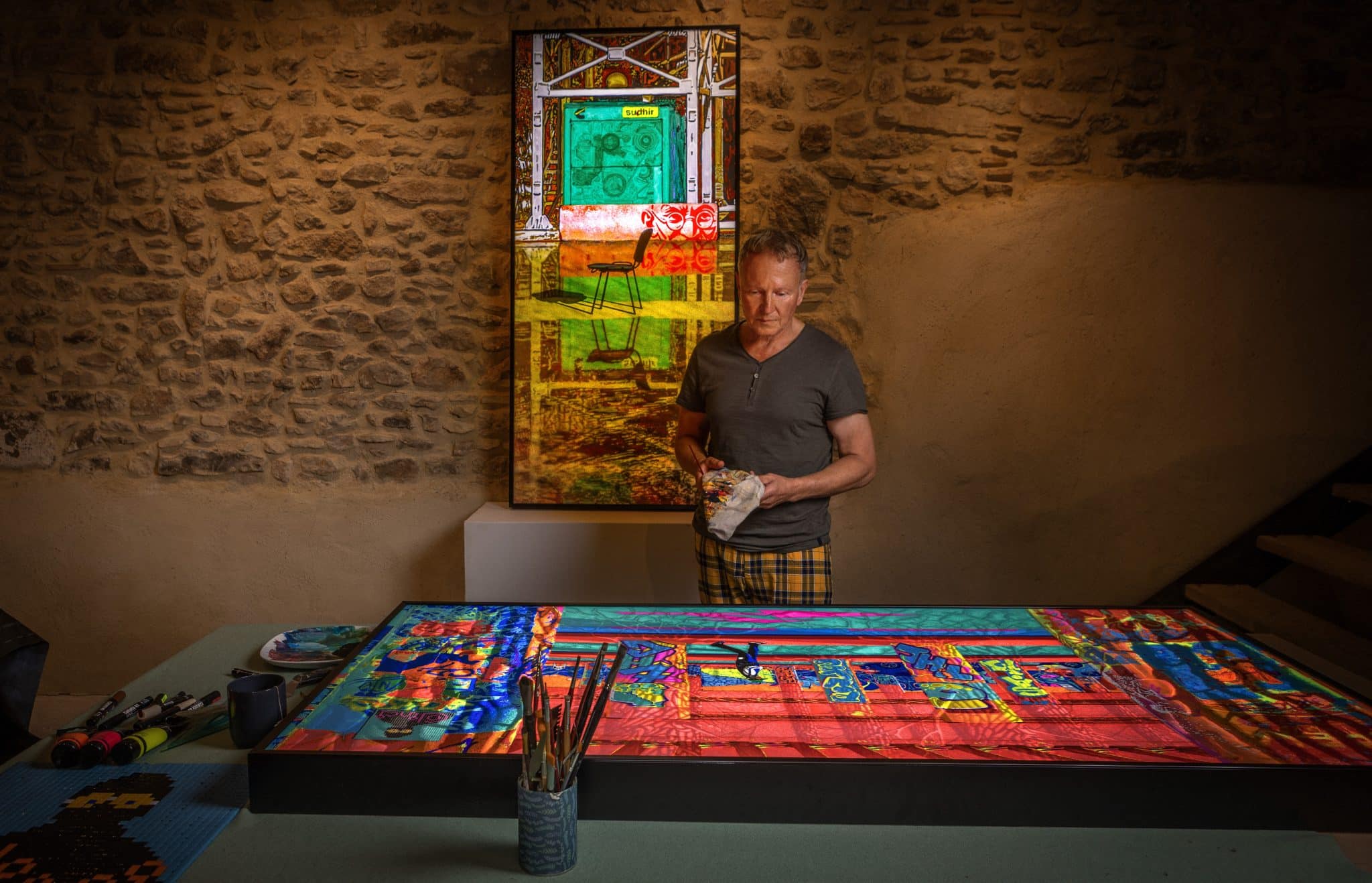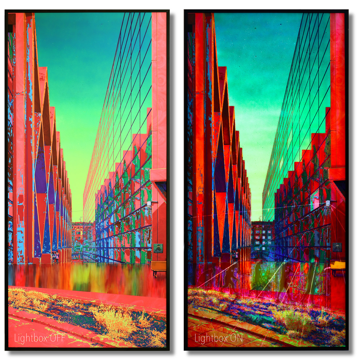 The pre-assembled frames were delivered with protective and base panels, allowing the artist to insert his motif panels himself. A surrounding frame strip secures the panels in place while also allowing for easy replacement. This preserves the flexibility of our lightboxes – otherwise known for interchangeable fabric prints – even within these art frames.